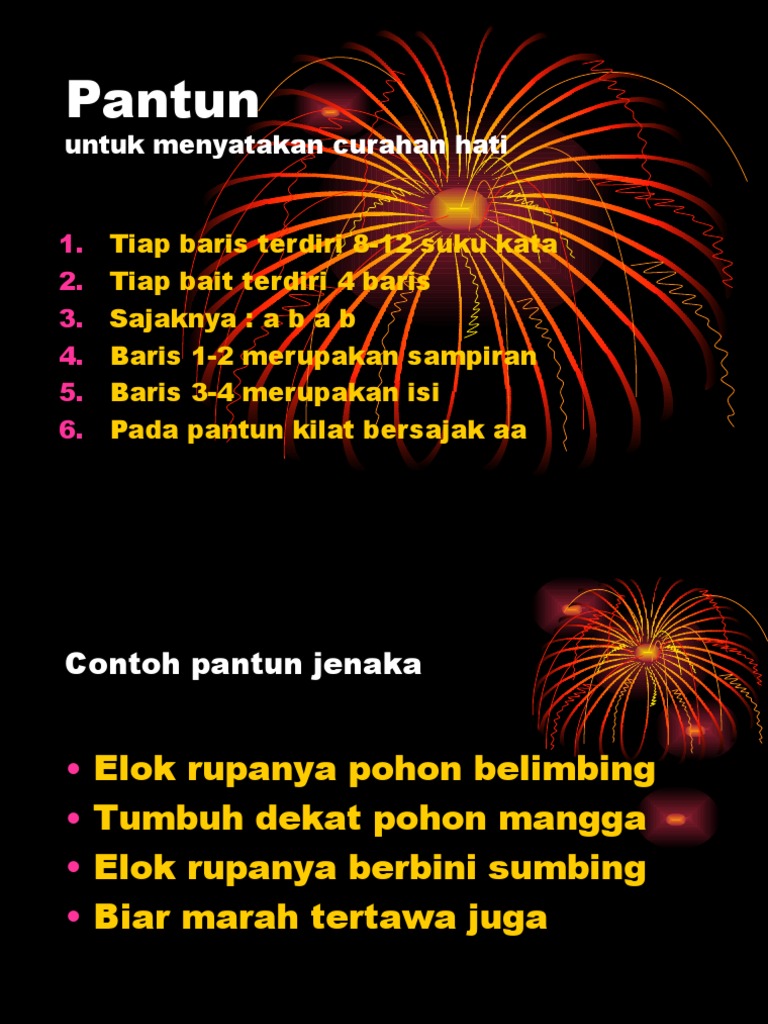 Di nusantara, budaya melayu klasik dengan pengaruh islam yang kuat meliputi sebagian besar negara pantai sumatra dan semenanjung malaya. (b) berisi empat baris setiap rangkap. Dimana baris pertama dan kedua disebut dengan sampiran dan baris ketiga dan keempat disebut dengan isi. (d) bilangan katanya tiga hingga lima patah kata sebaris. Pada masa ini karya sastra di dominasi oleh syair, pantun, gurindam dan hikayat. Unsur gaya bahasa dan keindahan bunyi (a) imej alam. (c) ada pembayang dan maksudnya. (e) terdiri daripada sembilan hingga sepuluh suku kata sebaris. May 15, 2021 · pantun merupakan puisi lama yang sangat dikenal oleh orang dulu atau sangat dikenal pada masyarakat lama. Ciri utama yang perlu ada dalam diri seorang pelajar cemerlang ialah mempunyai sahsiah dan peribadi yang unggul.